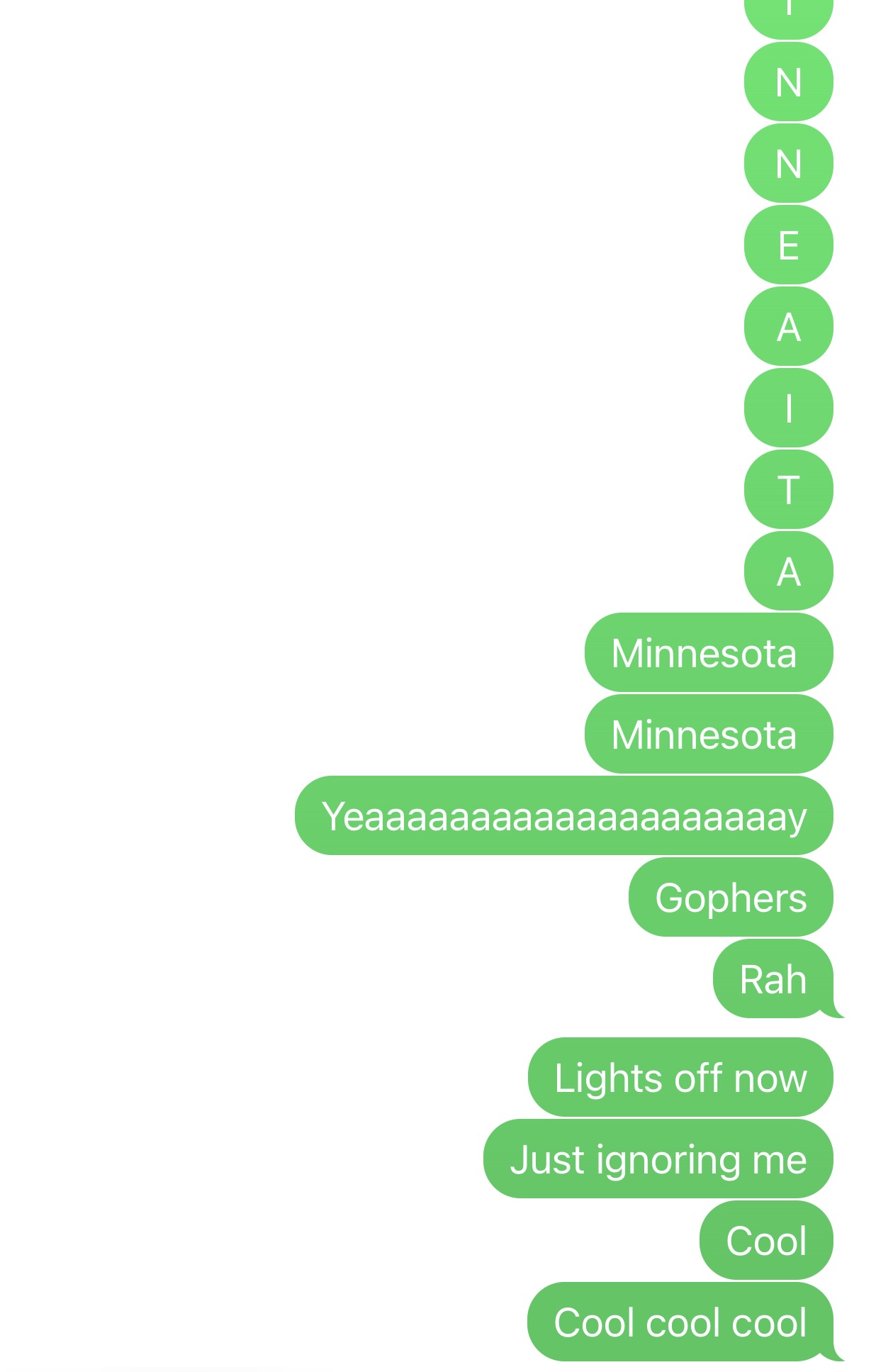 It is hilarious watching Colorado fans walk away from a campus bar in disappointment when they realize it has been overrun by Gopher fans chanting, “M-I-N-N-E-S-O-T-A!” Which we did a lot.